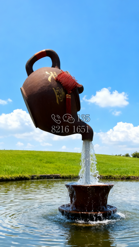 玻璃鋼材質(zhì),仿陶罐,大型流水景觀雕塑??偢?米,頂部陶罐長1.26米,中間主體陶罐高4.1米,去除底部一圈陶罐和外部飄帶造型,內(nèi)置水管水泵,水被抽入頂部陶罐,再從陶罐口留出,形成水流源源不斷永遠(yuǎn)流不完的錯覺。
